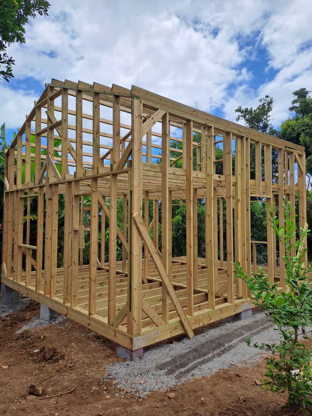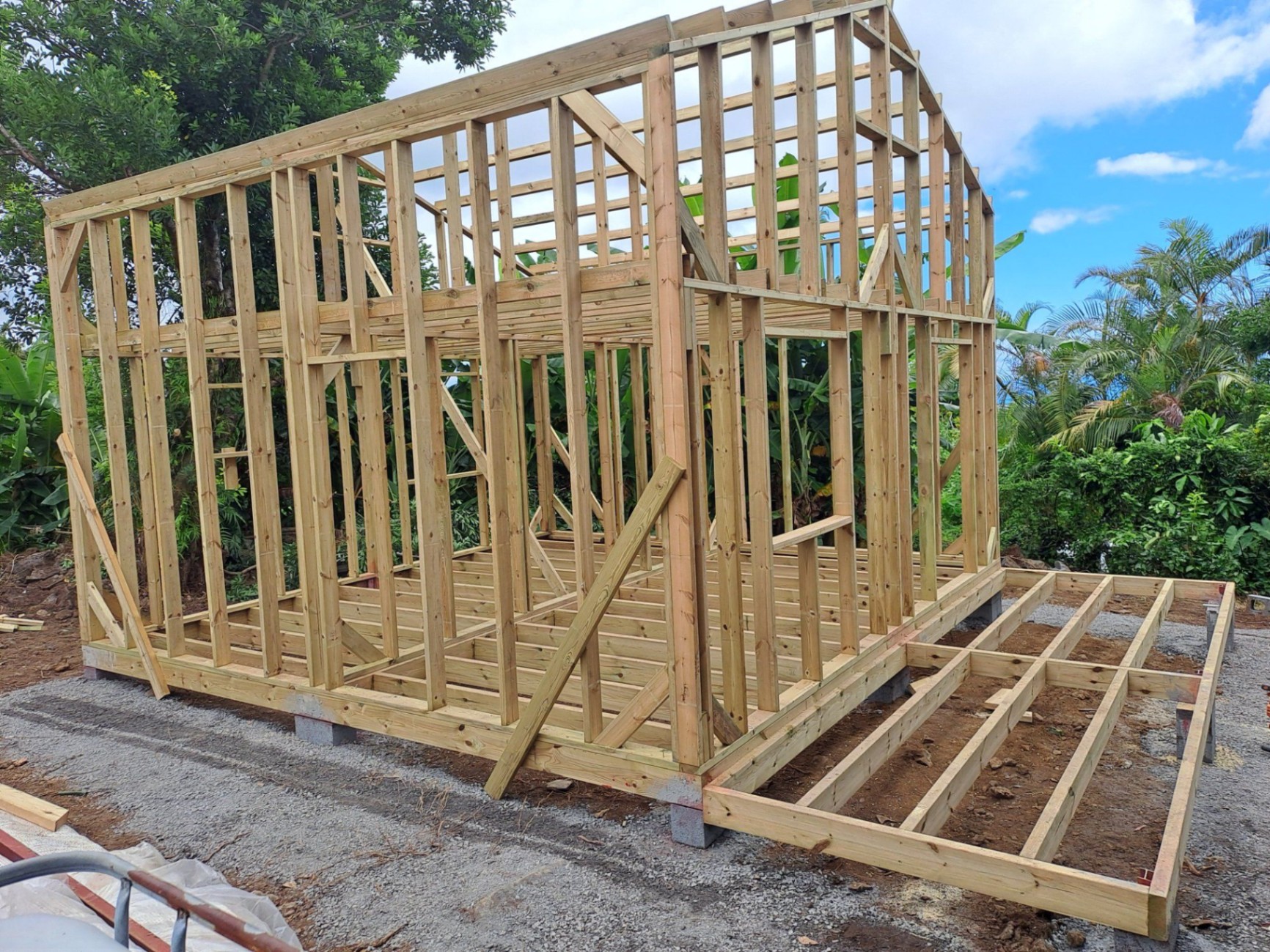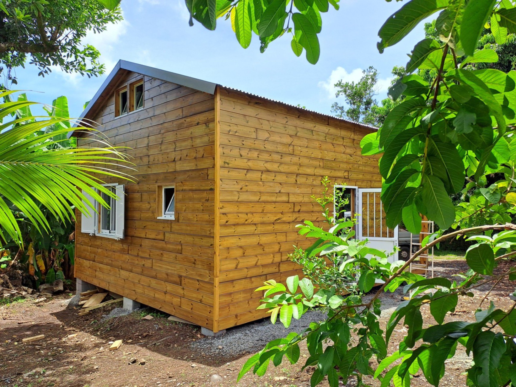 Implanté dans les hauts de l’Est de La Réunion, ce chalet bois de 36 m² avec mezzanine a été conçu pour s’adapter aux contraintes climatiques locales : humidité, pluies fréquentes et variations thermiques.